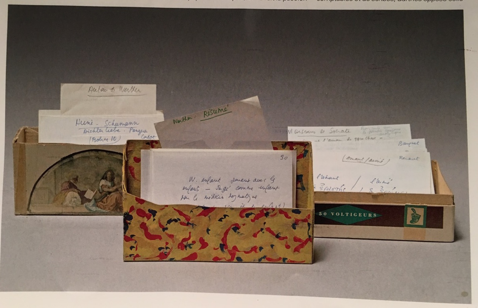 Cette idée est fortement connectée à la pratique rédactionnelle ordinaire de Barthes, qui lui fait utiliser un système de fiches interconnectées par des annotations, des listes et des renvois, fichier papier hypertextuel que Tiphaine Samoyault place au centre de l’organisation de la pensée barthésienne :