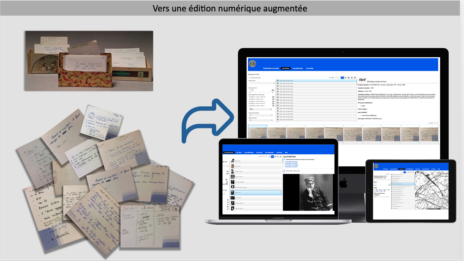6. Le site « ArchiBarthes », encore en version « fermée » le temps des testes nécessaires, s’adosse à une base de données Open Source (MySQL) créée sous le logiciel HEURIST et est hébergé sur les serveur de l’IR* HUMAN-NUM. J’en ai donné un aperçu lors d’une conférence filmée à la Bibliothèque nationale de France : « Dans le Fichier de Roland Barthes » [voir à 1:21:15]. Les illustrations et les échantillonnages donnés ci-dessous proviennent des manipulations dans cette base de données.