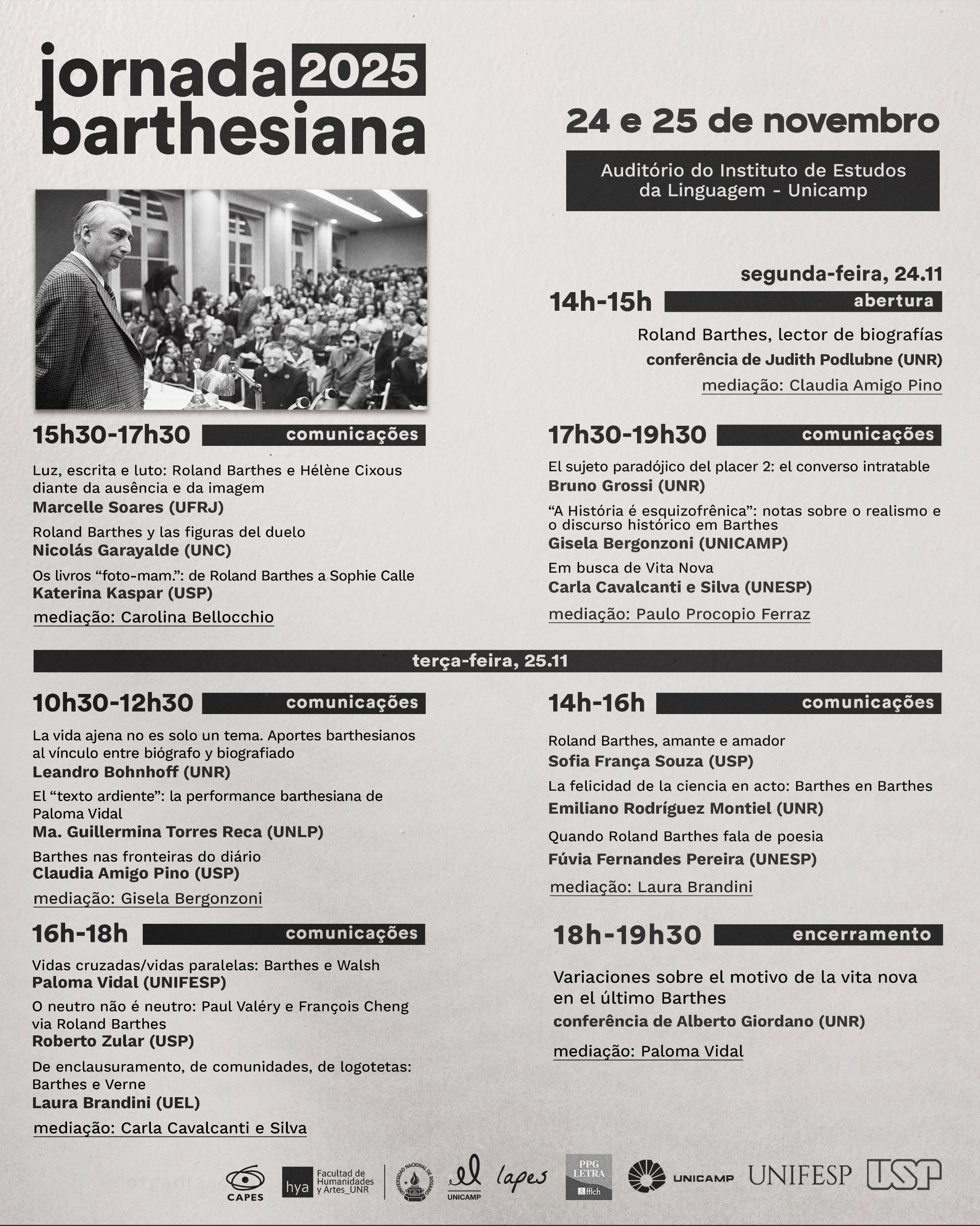 Poursuivant les collaborations entre chercheurs de la communauté barthésienne de l’Universidad Nacional de Rosario (Argentine) et des chercheurs/chercheuses brésiliens rattaché.e.s à diverses institutions du pays, cette troisième édition des Jornadas Barthesianas est proposée. Sa première édition, qui a eu lieu en août 2018, a inauguré ce réseau de contributions, l’événement ayant été accueilli par l’Universidad Nacional de Rosario, à l’initiative d’Alberto Giordano et de Judith Podlubne. La deuxième édition, en août 2022, a eu lieu dans le même esprit, comptant également sur la participation de représentants brésiliens. Dans cette troisième édition, les Jornadas seront accueillies par l’Universidade Estadual de Campinas et réuniront des chercheurs/chercheuses argentin.e.s et brésilien.ne.s. L’objectif est de mettre à jour les échanges autour de la circulation de l’œuvre de Roland Barthes dans ces deux contextes, en soulignant les points de convergence et de divergence dans les modes de lecture de l’œuvre de l’intellectuel français.