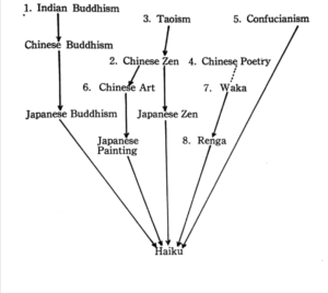 Dans la préface du 1er volume, Blyth formule clairement ce qui était déjà implicitement présent dans Zen in English Literature and Oriental classics : le haiku est la matérialisation par le langage de la pensée zen : « Il est nécessaire de comprendre les haïkus à partir d’un point de vue zen[38]. » Il entame ensuite dans le premier chapitre (Section I) un vaste panorama nommé « The Spiritual Origins of Haiku » (Les origines spirituelles du haïku), qu’il décline de la façon suivante : « Bouddhisme, Zen (Bashô et le zen), Taoïsme, Poésie chinoise, Confucianisme, Art oriental, Waka, Renku, Nô/Ikebana/Chanoyu, Shintô ». Un schéma intitulé « The various streams of thought-feeling » (les différents courants de pensée-sensation) organise cet ensemble sous forme d’une arborescence, où tout converge vers le haïku :